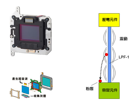 | 相機內灰塵的產生一般分成外部進入及內部產生二種途徑。外部灰塵在更換鏡頭的過程中進入,但無法預測何時發生,而在機身內部(如快門組件等)採用了抑制塵屑產生的構造和材質,並進行了抗靜電處理及「接地」設計,可以大大減少塵屑產生及吸附的機率。 |
